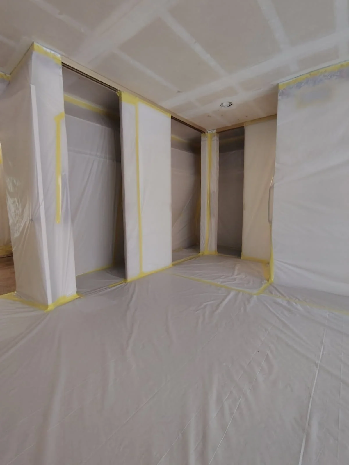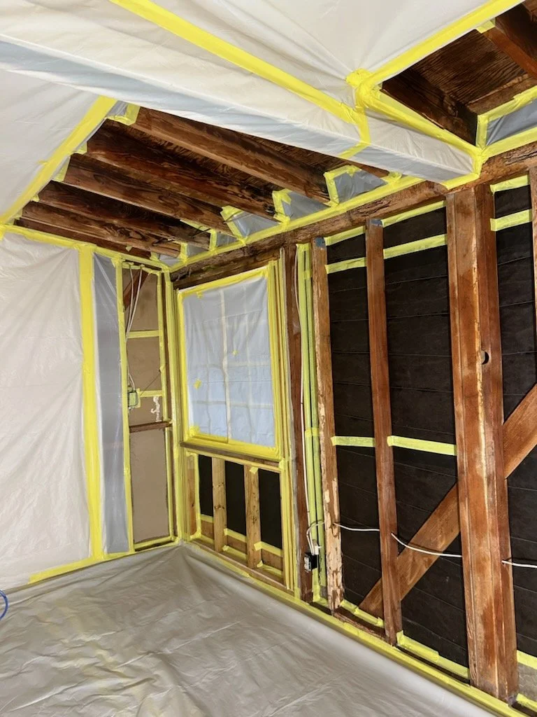 Showing perfect full asbestos containment covering all walls and floor with plastic creating a negative pressure containment for proper asbestos removal. Showing a clean ceiling surfaces after asbestos acoustic has been removed.